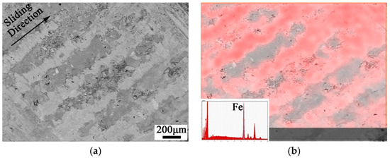 SEM morphology and EDS analysis were performed on the surface of the C6 disk specimen, with the results shown in Figure 11. The figure indicates that mass transfer occurs between the matrix and graphite during the grinding of both the pin sample and disk sample. The graphite adheres to the wear surface of the pin sample, and the adhesive material of the C6 disk sample on the pin surface adhered along the wear direction. Further, the adhesive area covered by graphite on the wear surface of the pin sample was larger than that on the O6 pin sample. The adhesive region of the C6 pin specimen surface’s matrix coincides with the graphite adhesive area. Additionally, the high oxygen content region coincides with the adhesive area, which indicates that the lubricating film formed on the C6 disk specimen’s wear surface covered the adhesive on the pin surface. That is, during the grinding process, the pin specimen and C6 disk specimen adhered to the lubricating film formed on the wear surface of the C6 disk specimen. This change from U75V to the lubrication film reduced the coefficient of friction and wear rate of the C6 disk sample compared to that of the O6 sample.