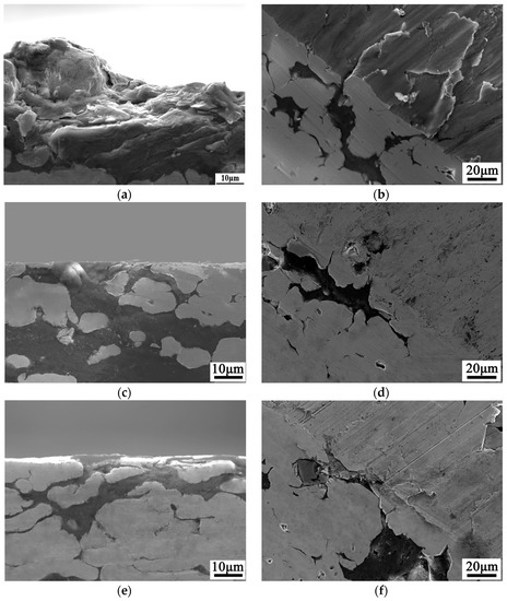 The wear surfaces of samples O6, C6, and N6 were analysed through direct section SEM analysis, and the results are shown in Figure 13. The analysis revealed numerous spalling pits on the subsurface of O6, thereby indicating that the matrix has a low bonding strength with graphite, leading to a considerable amount of matrix spalling during the wear process. Direct section plane analysis of C6 in Figure 13c shows that the wear surface is flat. The analysis reveals that the matrix that appears to be spalling in the area of weak diffusion bonding between graphite and matrix or in the area of mechanical bonding was cleaved by graphite and exposed on the wear surface. Figure 13e shows the straight section of N6, on which there are no spalling pits formed by tissue spalling on the subsurface, and the wear surface is flat. Consequently, the wear rate on the graphite powder surface of the Cu-based self-lubricating materials after Ni plating is lower than that on the surface of the graphite powder with Cu plating and without Ni plating. Oblique section analysis was also conducted. SEM analysis was carried out on the oblique section of samples O6, C6, and N6, and the results of the analysis are depicted in Figure 13b,d,f. According to the analysis in Figure 13b, the whole matrix wrapped by graphite appears to have spalling on the subsurface of O6. The bonding strength of carbon and Cu is low, and the matrix spalling during the wear process led to an increase in the wear rate of O6. Figure 13d shows that in the subsurface layer of C6’s wear surface, the matrix is well combined with graphite, the matrix completely plated with graphite does not flake off, and there are spalling pits formed by micro-matrix spalling on the wear surface. In contrast, as displayed in Figure 13f, the plated graphite matrix in N6 has no spalling, and the wear surface is intact, owing to the improved bonding strength between carbon and Cu.