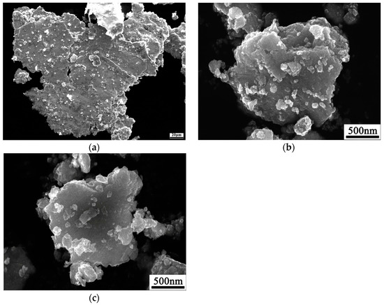 SEM analysis was performed on the wear scraps generated in the wear testing of the O6, C6, and N6 disks, and the results of the analysis are depicted in Figure 14. A comparison of the results shows that the size of the grinding chips from the C6 and N6 disks is much smaller than that from the O6 disks. The chip size from the O6 disk is about 107.7 μm, whereas the chip sizes from the C6 and N6 disks are flake-like and massive, respectively. Specifically, the size of the C6 chip is 1.4 μm, and that of the N6 chip is 1.1 μm. This implies that without graphite coating, the grinding chip’s formation mode is that the graphite splits the matrix and leads to spalling off, with graphite failure occurring without lubrication. After Ni and Cu plating on the surface of the graphite powder, the wear surface of the disk sample experiences fatigue and forms abrasive chips, which are flakier. However, both the number and size of the N6 chips are smaller than those of C6, indicating that there was less fatigue failure of the wear surface of the N6 disk samples. Consequently, the effect of Ni plating on the wear resistance of Cu-based self-lubricating materials is superior to that of Cu plating.