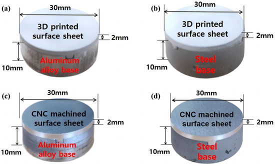 Samples in different combinations. (a) 3D-printed surface + aluminum alloy base; (b) 3D-printed surface + Steel base; (c) CNC-machined surface + aluminum alloy base; (d) CNC-machined surface + Steel base.