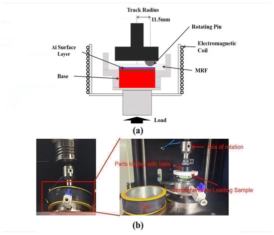 The friction and wear test of the sample combination using magnetorheological fluid (MRF) as a lubricant in the electromagnetic coil is shown in Figure 2a. To mitigate the effect of metal parts within the wear test system on the energized coil, Figure 2b shows the schematic of the actual component assembly. In this setup, all metal parts within the coil were replaced with high strength Polylactic acid (PLA) 3D-printed parts. The hardness and young’s modulus of the PLA material were sufficient to withstand the 100N load applied during the friction and wear test without deformation or breakage.