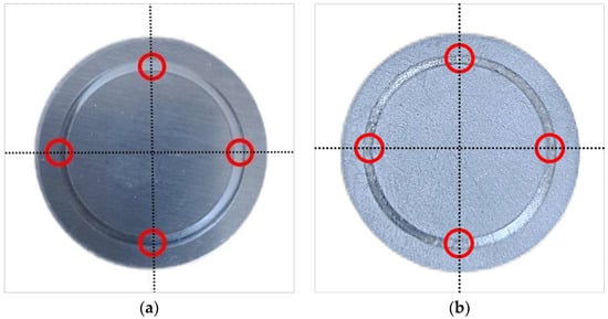 The surface roughness test location of the sample, the dotted line in the figure represents the axis of symmetry, and the red circle represents the position of the surface roughness test. (a) CNC-machined surface, (b) 3D-printed surface.