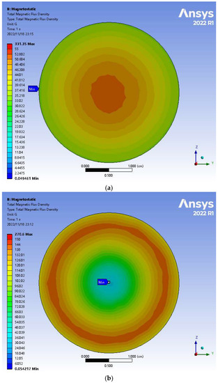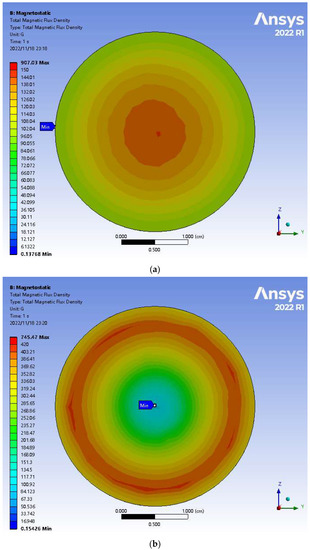 Comparing the evaluation of the surface magnetic field strength of different combined specimens simulated by ANSYS, the magnetic field intensity on the surface of the steel base combined specimen was more significant than that on the surface of the aluminum alloy-base combined specimen under the same current condition. When the base of the combined sample was aluminum alloy, the magnetic field intensity was concentrated towards the center of the wafer. When the base of the combined sample was steel, the magnetic field intensity distribution concentrated toward the edge of the surface [30]. The reason for this change in magnetic field distribution is that the sample was inside the electromagnetic coil. The electromagnetic coil can be regarded as a magnet when it is energized, so it was equivalent to the sample being in the inner center of the magnet as shown in Figure 4a. The magnetic field strength followed the direction of the magnetic induction line, which pointed towards the center of the magnet. When a ferromagnetic metal was placed in an electromagnetic coil, it was magnetized and became a magnet. At this point, the surface layer was on the surface of the ferromagnetic metal base, which was equivalent to being outside the magnetic pole of the magnet. The direction of the magnetic field line was bent and pointed to the other side. The magnetic field line of a magnetic pole at the center was inclined to the edge to form the magnetic field distribution shown in Figure 4b. Since the distance moved at the edge was the largest during the rotation, the utilization rate of the frictional force was the largest; the distance moved at the center of the circle was the smallest, and the utilization rate of the frictional force was low. Therefore, this magnetic field distribution of the steel base sample had a higher utilization rate of the magnetic field.