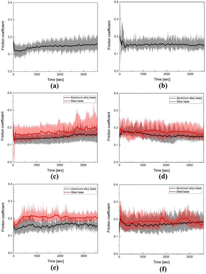 Friction coefficient of 3D-printed surface and CNC-machined surface under different conditions. The material of the base will not be affected when there is no electromagnetic field, so no legend is added to the line diagram when the current = 0, and the shaded part of the line diagram represents the fluctuation of the friction coefficient. (a) Current = 0A, 3D-printed surface; (b) Current = 0A, CNC-machined surface; (c) Current = 0.8A, 3D-printed surface; (d) Current = 0.8A, CNC-machined surface; (e) Current = 2.5A, 3D-printed surface; (f) Current = 2.5A, CNC-machined surface.
