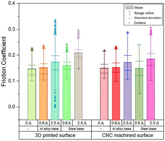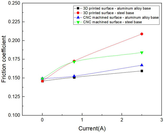 Figure 6 shows the friction test results of four composite specimens for two types of surfaces and two types of bases when the electromagnetic coil currents were 0 A, 0.8 A and 2.5 A, respectively. Observing the friction test results shown in Figure 5, it can be concluded that the friction coefficient of the composite sample with steel base was greater than that of the composite sample with aluminum alloy base under the same current conditions (excluding current = 0). This effect of 3D-printed surfaces in metal was stronger than CNC-machined surfaces.