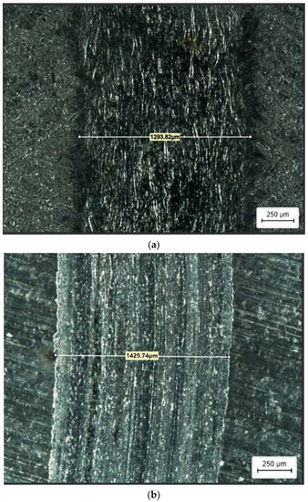 Figure 3 shows the worn section of the sample, and it was important to select the micrograph and worn section with the score closest to the average for a meaningful comparison. Figure 9 shows photomicrographs showing wear marks on both the 3D-printed metal surface and the CNC-machined surface without stress. When comparing these surfaces, it was apparent that the wear marks on the 3D-printed metal surface appeared rougher but narrower than the CNC-machined surface. However, closer inspection revealed that the rough grooves on the worn part of the metal 3D-printed surface were not a result of additional wear, but rather a characteristic of the 3D printing process. These distinctive dimples played a role in reducing the frictional contact area between the component surface and the test ball during friction testing, like the application of dimples in the metal hand-scraping technique to reduce the coefficient of friction. This explains why the metal 3D-printed surface had a lower coefficient of friction than the CNC-machined surface in the absence of current.