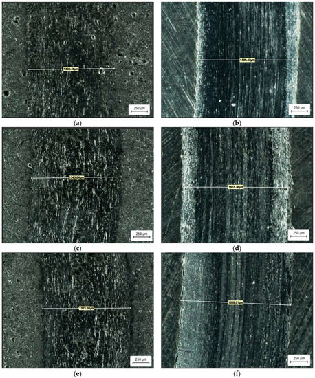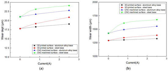 There was also an interesting relationship between the width of the wear marks and the applied stress. On the metal 3D-printed surface, the width of the wear marks showed a decreasing trend as the stress increased. Conversely, the width of the wear marks on the CNC-machined surface showed an increasing trend with increasing stress. In addition, when the wear marks of the aluminum alloy base combination were considered, their width decreased with increasing current. Conversely, the width of the wear traces for the combined samples showed an increasing trend with increasing current.