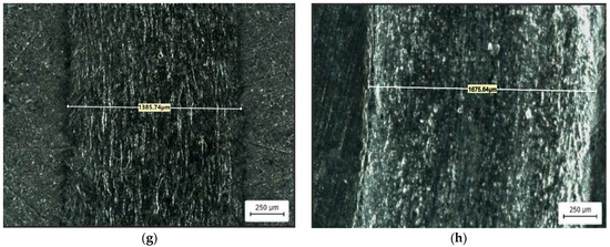 Surface wear marks of each control group sample under the optical microscope. (a) Current = 0A, 3D-printed surface; (b) Current = 0A, CNC-machined surface; (a) Current = 0.8A, 3D-printed surface—Al base; (b) Current = 0.8A, CNC-machined surface—Al base; (c) Current = 0.8A, 3D-printed surface-steel base; (d) Current = 0.8A, CNC-machined surface-steel base; (e) Current = 2.5A, 3D-printed surface—Al base; (f) Current = 2.5A, CNC-machined surface—Al base; (g) Current = 2.5A, 3D-printed surface-steel base; (h) Current = 2.5A, CNC-machined surface-steel base.