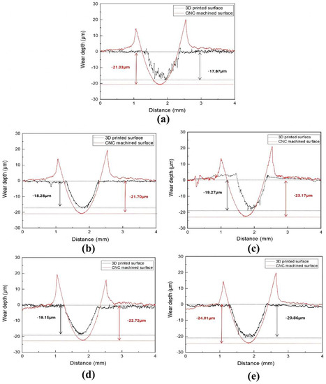 Wear scar profile plot of each control group. (a) Current = 0A; (b) Current = 0.8A, Al base; (c) Current = 0.8A, Steel base; (d) Current = 2.5A, Al base; (e) Current = 2.5A, Steel base.