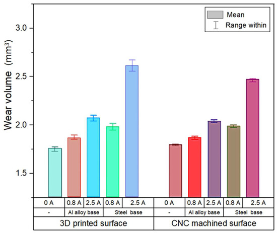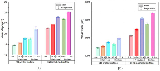 The wear test results of each experimental group are presented in Table 5, and the results are depicted as histograms in Figure 12. When tested under identical conditions, the CNC-machined surface exhibited significantly greater wear width and depth than the 3D-printed surface. However, the test results for the 3D-printed surface had a wider fluctuation range than the CNC-machined surface, and the range increased with voltage. In addition, at the same voltage, the steel base group showed larger test results and fluctuations than the aluminum alloy base group.