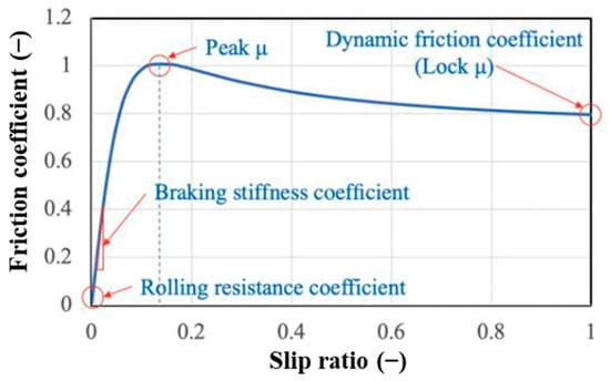 where , , and denote the coefficients representing the shape of the μ–s characteristics, and is the offset, which represents the rolling resistance on a horizontal road. By differentiating this function with respect to , treating the differentiation result as 0, and substituting the solution for s into Equation (2), the peak is obtained as shown in Equation (3). However, is ignored because the rolling resistance is small.