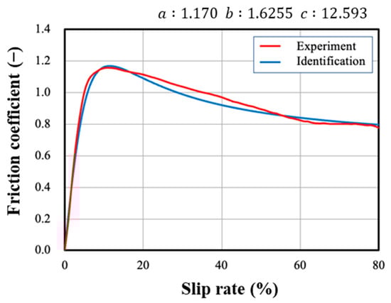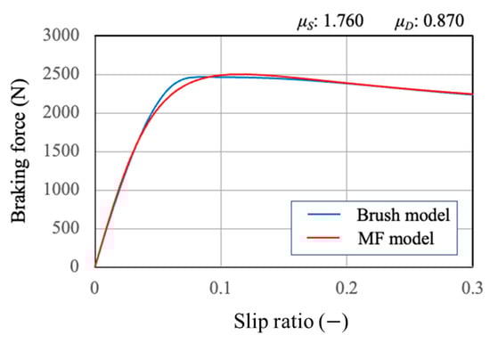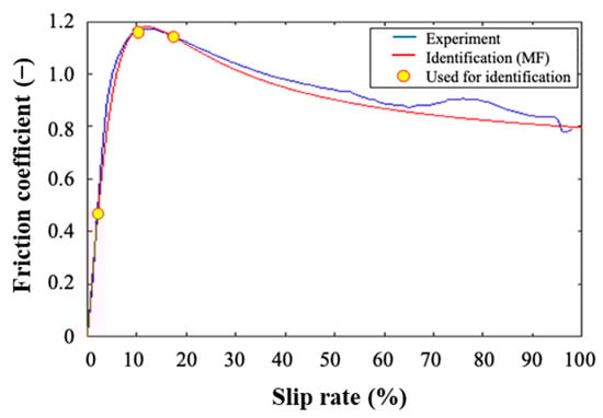 Based on these results, Figure 18 presents a comparison of the identification results obtained using the MF and those obtained using the brush model. To identify the brush model, the lock μ of the MF was , and was used as a parameter. As a result, it was found that good identification can be realized with the brush model.