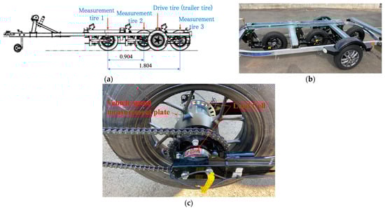 (a) Tire placement of measurement trailer []. (b) Overview of measurement tire arrangement []. (c) Sensor for detecting forces and speed pulse [].