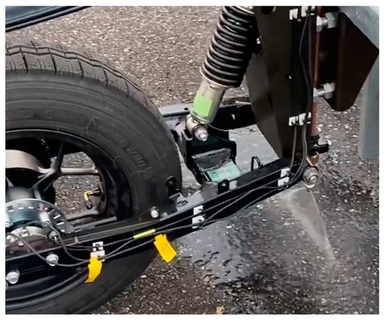 Considering the chain length, the measurement tires were arranged with two wheels in front of the main tire and one wheel behind the main tire; to avoid chain interference, the sprocket of the second wheel was opposite to that of the other tires. Figure 6a–c presents an overview of the measurement tire arrangement of this trailer system, its photograph, and the arrangement of the load cells and speed pulse detection system, respectively. In addition, this friction characteristic measurement should comprise measurements made under dry and wet conditions. Figure 7 presents a photograph of a sprinkler installed in front of the tire to be measured.