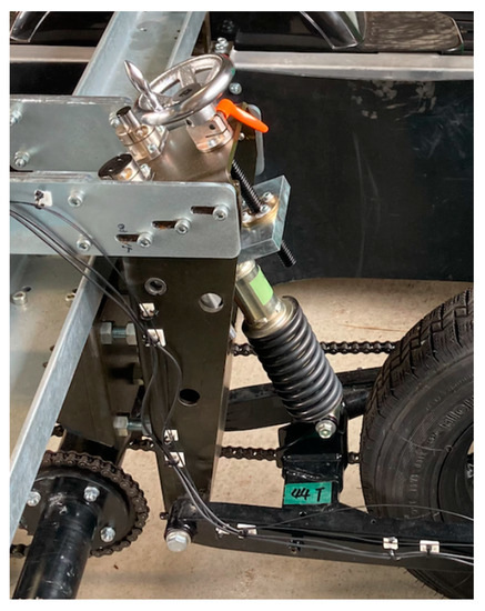 In the measurement of road friction characteristics, it is important to determine the type of tire to be measured and set the tire load and internal pressure that affect the tire characteristics. In particular, when measuring on ordinary roads in Japan, it is necessary to design the trailer according to the standards for lightweight trailers for towing passenger cars and to keep the total weight at less than 7.35 kN. Because the trailer has five tires, including three tires for measurement, the load on each tire should be small. In general, the friction coefficient of rubber depends on the load, and the smaller this value, the larger the friction coefficient. Considering these balances, the device was set based on the μ–s characteristics measured using a bench tire characteristic tester. A bench tester was used to conduct an internal pressure change experiment, and the peak μ was investigated. Consequently, the load for each wheel was determined to be 500 N, and the internal pressure was set to 150 kPa to set the conditions for the experiment. The set load for each measurement wheel was realized using the load adjustment mechanism installed for each measurement wheel, as shown in Figure 9. The mounting position of the suspension spring in the device is adjusted using a steering wheel.