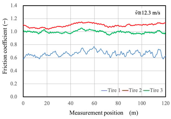 Continuous friction coefficient obtained from each tire at 40 km/h (experimental results).