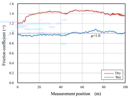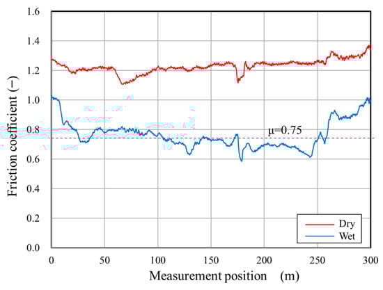 Figure 14 shows the measurement results for the dry and wet conditions while driving on a low-μ road. On the horizontal axis, “0” represents the beginning of the low-μ road, and the section from there to approximately 270 m is the low-μ section. In addition, from the relationship of the pavement continuity, it can be observed that the low-μ state is reached after a variable section of approximately 30 m. This result clearly appears in the wet condition. Before and after this low-μ section, the friction characteristics are almost the same as those of the high-μ road in the wet condition. When observing this low-μ section on a dry road surface, it was found that there was not much variation compared to the sections before and after this section. Therefore, even in this low-μ section, a relatively high road surface friction coefficient is secured under dry conditions; however, under wet conditions, the friction coefficient decreases rapidly, with a maximum reduction of approximately 0.6. Although there was little difference in appearance between the two road surfaces, the degree of decrease in the coefficient of friction differed significantly when the road surface became wet. It was also found that a decrease of approximately 40–50% occurred, and such a road surface database is important from the viewpoint of road traffic safety.