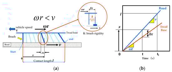 Here, the first term on the right side is defined as the slip ratio . Furthermore, if is the longitudinal rigidity of the brush at position , and is the tread width, the force generated in this brush is expressed by Equation (12).