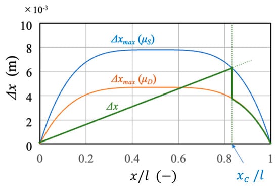 As an example, Figure 17 presents a conceptual diagram of the calculation results obtained with a contact width of 0.2 m, contact length of 0.25 m, of 2.5 kN, and brush fore and aft rigidity of 8 × 106 N/m2. The brush displacement with a constant slip ratio, shown in Figure 13b, is superimposed in this figure. Assuming that the slip ratio is constant and the relative speed between the road surface and tread base is constant, it increases linearly; however, when it reaches , which is described as the maximum static friction, no further frictional force can be obtained, and it starts to slip. However, there exists a mixture of brushes that have reached a critical state and those that have not. For simplicity, we did not consider the comprehensive line characteristics from the maximum static friction to DF. Therefore, each brush was displaced along the green line, and the braking force was calculated from these displacements using Equation (23).