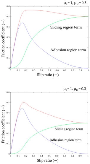 Using the brush model, it is possible to separate the components of the μ–s characteristics into adhesion and sliding regions. The analytical results are shown in Figure 19 as an example. As an example, the results were obtained by analyzing at 1 and at 0.3 and 0.5. In the analysis under these conditions, as is the same, the adhesion region term is the same in the two figures, but the sliding region term varies greatly. It was found that the shape of the μ–s characteristic and the peak μ value were significantly different. Therefore, it is effective to perform such a factor analysis for μ–s characteristic estimation.