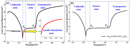 The polarization curves of the substrate and Al0.8CrFeCoNiCu0.5B0.1 HEA coating. (a) the polarization curve of the substrate, with the inset showing an enlarged view of the anodic dissolution area on the curve; (b) the polarization curve of the coating.