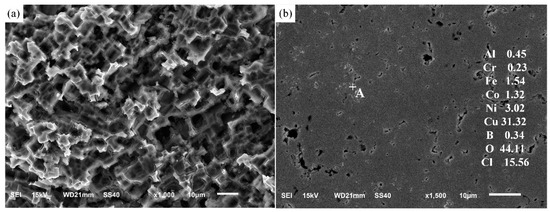 Figure 2 showcases the microscopic corrosion morphologies of the 5083 aluminum alloy and the Al0.8CrFeCoNiCu0.5B0.1 high-entropy alloy (HEA) coating. From previous studies on the microstructure of the 5083 aluminum alloy [29], it was found that the alloy consists of an Al matrix phase, an Al(Mn, Fe, Cr) phase presenting as fish-bone-like structures, and a Mg2Si phase dispersed as blocky particles throughout the matrix. After conducting polarization tests, it was identified that the 5083 alloy substrate had been extensively corroded, as seen in Figure 2a. In contrast, the surface of the HEA coating maintained its integrity, although corrosion products were evident. Figure 2b shows that the Al0.8CrFeCoNiCu0.5B0.1 coating exhibits selective corrosion characteristics, with some pitting irregularly distributed. However, some corrosion pits also display intergranular corrosion traces, yet these pits do not propagate further. EDS analysis of the corrosion products in the coatings reveals that the products are primarily oxides and chlorides of Cu.
