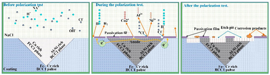 Figure 3 shows the polarization testing mechanism of Al0.8CrFeCoNiCu0.5B0.1 coating. Our previous studies have revealed that the Al0.8CrFeCoNiCu0.5B0.1 coating is primarily composed of FCC1, BCC1, and BCC2 phases [25]. The FCC1 phase, which is predominantly found within the intergranular structure, is rich in Cu. The BCC1 phase is rich in Fe and Cr, while the BCC2 phase is rich in Al and Ni. Boron is present within the structure as a solid-solution element. This contrasts with the findings of G ü nen et al., where boronizing treatment of AlCoCrFeNi high-entropy alloy led to the formation of (CoFe)B2, (CrFe)B2, and Cr2Ni3B6 phases under different conditions. Given that no second phase containing B was detected in the XRD test, it can be inferred that B exists in the high-entropy alloy matrix as a solid-solution element. Combined with the EDS analysis of the corrosion products, it is confirmed that the Cu-rich FCC1 phase is preferentially corroded.