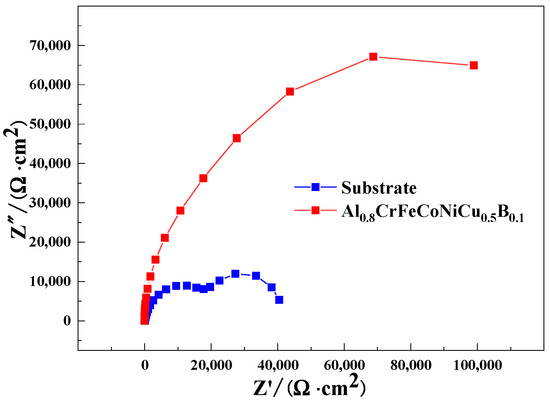 Nyquist plots of the Al0.8CrFeCoNiCu0.5B0.1 HEA coating and substrate.