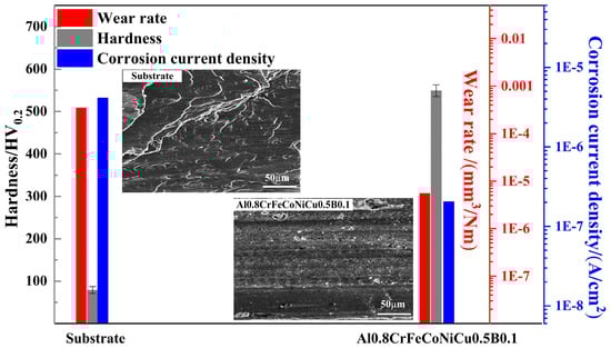 To comprehensively evaluate the feasibility of using Al0.8CrFeCoNiCu0.5B0.1 for surface modification of aluminum alloys, the overall performance of the coating has been analyzed [25]. Figure 6 shows the hardness and wear rate of the Al0.8CrFeCoNiCu0.5B0.1 high-entropy alloy coating compared to the base material. The hardness of the coating reached 549HV0.2, which is eight times that of the base material, and the wear rate was 5.53 × 10−6 mm3/Nm, two orders of magnitude lower than the base material. Observations of the worn surfaces revealed serious layer cracking and plastic deformation in the base material. In contrast, the worn surface of the Al0.8CrFeCoNiCu0.5B0.1 coating was smoother, with visible grooves and wear particles, without any delamination or plastic deformation, suggesting that the wear mechanism is adhesive wear and abrasive wear. Therefore, in terms of corrosion resistance, hardness, and wear resistance, this coating outperforms the base material on all fronts. From the perspective of material performance, Al0.8CrFeCoNiCu0.5B0.1 demonstrates significant feasibility as a surface modification coating for aluminum alloys.