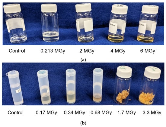 External appearance of LVO 500 oil after (a) γ dose and (b) neutron dose at different total dose levels.