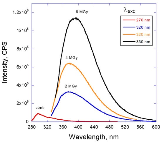 The fluorescence emission peaks of the irradiated oil are quite different from those associated with the unirradiated oil. For the gamma-ray-irradiated oil, not only does the emission peak intensity go through a maximum, but also there is a spectral shift depending on the excitation wavelength. Figure 3 demonstrates this effect for irradiation doses up to 6 MGy. It can be seen that the intensity of the emission increases by at least one order of magnitude in comparison with the pristine oil and depends strongly on the dose. Simultaneously, the maximum of the emission peak moves from UV (350 nm) to visible light (400–500 nm). A family of emission curves recorded for varied excitation wavelengths form a broad “envelope” curve spreading over 250 nm in the spectral range. The position of the maximum of the envelope also moves to higher wavelengths with the dose of gamma radiation.