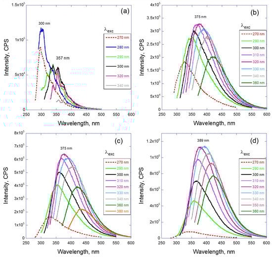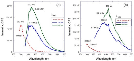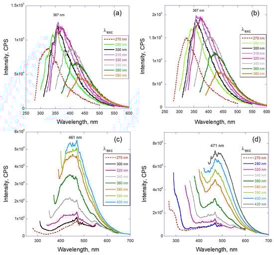 Similar to the gamma irradiation analysis, the dependence of emission intensity on the excitation wavelength is presented in Figure 5. Representative curves are shown for two situations: low dose of radiation (0.17 and 0.34 MGy—Figure 5a,b) and high dose of radiation (1.7 and 3.3 MGy—Figure 5c,d). The low dose samples demonstrate the features similar to gamma-irradiated samples (compare with Figure 3), which are the bell-like shape of the envelope and excitation-dependent wavelength position of the peak maximum. Graphs (c) and (d) of this figure demonstrate the more traditional behavior of the PL, where the position of the emission maximum remains the same and just the intensity of the emission varies with the excitation wavelength.