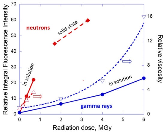 A comparison of the relative changes of the intensity depending on the dose of radiation is presented in Figure 6 for both gamma-ray and neutron-irradiated samples and characteristic features of the aggregate state, physical appearance and PL spectra of the samples are summarized in Table 1. Figure 6 demonstrates a good correlation between PL enhancement and increase of the relative viscosity of the oil as a result of radiation exposure. Interestingly, the same type of characteristic behavior of the PL integral intensity and viscosity versus the dose is observed for neutrons and gamma ray exposure (i.e., linear dependence for the former case and nonlinear exponential dependence for the latter case). Therefore, PL properties can be linked to physical properties of the system and can be used as a simple method for monitoring of the aging imposed by radiation.