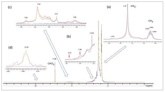 Based on the observed changes of the color it would be natural to assume some oxidative degradation of the material under irradiation []. In order to understand chemical changes in the oil we have made a detailed spectroscopic study with 1H NMR and FTIR techniques. The digested NMR spectra are shown in Figure 7 and more detailed spectra in the supplementary file (see Figure S2). The survey spectrum in Figure 7 as well as the Insert (a) demonstrate high purity of the oil with almost 100% of the spectrum intensity corresponding to aliphatic chains (more intensive singlet peak of -CH2- groups at chemical shift δ = 1.28 and less intensive quartet at δ = 0.881 for -CH3 end groups) []. The peak at δ = 7.28 corresponds to a residual solvent (CHCl3) present in less than 0.1% quantity and can be used as a reference for estimation of the concentration of other chemical groups (impurities or generated under irradiation). The main changes observed in NMR spectra due to irradiation appear in three parts of the spectra: δ = 1.5–2.5 range (insert b), δ = 4–6 range (insert c), and δ 9.8 (insert d). The observed new features are similar for gamma- and neutron-irradiated samples. The first range (δ = 1.5–2.5) corresponds to oxygen-containing aliphatic groups (ketones), while the second one (δ = 4–6) gives evidence of generation of conjugated fragments in the aliphatic chains under irradiation. Comparison of the intensity of these new peaks with the residual CHCl3 peak intensity shows that the new groups in the range 1.5–2.5 are generated in millimolar quantity while other groups appear in ppm concentration (especially the peak at δ 9.8, which can be assigned to some aromatic structures).
