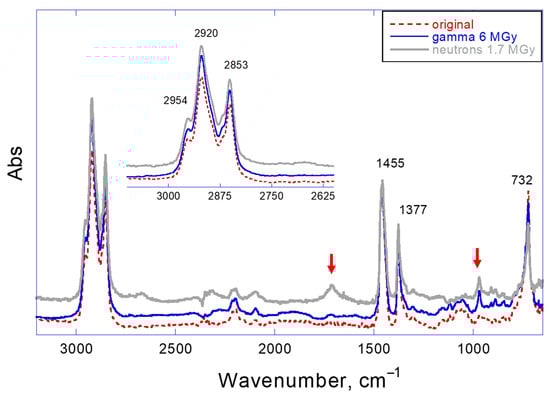 Infrared spectroscopy generally supports this conclusion (Figure 8). The ATR-FTIR spectra show the appearance of new peaks at 970 cm−1, which can be assigned either to conjugated fragments or to bending vibration of oxygen-containing groups []. Higher doses of radiation in the case of neutron exposure is accompanied with an additional peak at 1714 cm−1, which may belong to hydroxylic or ketone oxygen-containing groups in the aliphatic chains []. It should be mentioned that no significant oxidation could be found in the oil if the dose of radiation did not exceed 4 MGy (gamma) or 0.68 MGy (neutrons).
