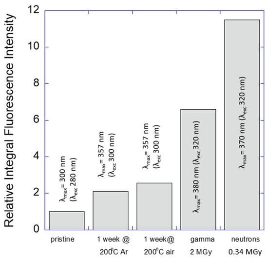 Thermal oxidative degradation of oils was a subject of many previous studies []. In order to shed light on the exact type of clusters responsible for PL, two additional experiments were carried out: thermal treatment at 200 °C for one week in the presence of oxygen; or in an inert atmosphere of argon. In both cases the oil gained PL properties. Oxidative thermal degradation was accompanied by color changes while the oxygen-free environment resulted in a colorless, transparent material. PL spectra in both cases were similar to those observed for irradiated samples but with smaller intensity (Figure S3). Therefore, one can conclude that radiation exposure has a similar effect on the structure of the mineral oil to thermal treatment. However, the magnitude of the PL peak enhancement was in this case much smaller than in the case of the ionizing radiation exposure. Figure 10 demonstrates that even a short time (relatively low dose) gamma-ray or neutron beam exposure of the mineral oil brings significantly (3 to 5 times) higher PL peak integral intensity in comparison to a one-week thermal degradation process. The observed visual changes (coloration) of the oil are mainly due to an oxygen attack while the appearance of the PL properties is mainly due to conjugated fragments, which may or may not be directly related to oxygen-containing groups in the exposed oil.
