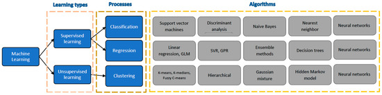Machine learning techniques can be categorically divided into supervised learning and unsupervised learning [22,23]. Each of these types consists of different processes and algorithms, as shown in Figure 1.