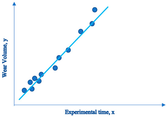 Regression analysis is a widely used technique to analyze multifactor data [29]. The basic idea behind linear regression is to get a line that best describes the relationship between the input and output variables. For example, if x represents an experimental time and y represents a wear volume, then as shown in Figure 2, the straight-line equation relating these two variables could be as follows: where is the intercept and is the slope.