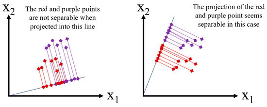 The main intuition behind a discriminant analysis (linear) is to find a hyperplane where the projection of the classes will have maximum separability, as shown in Figure 5. Let us assume that the projection of data point X onto the line is y, where , and the projection vector . We can write
