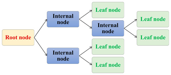 The Decision Tree works in a tree-like structure, where the topmost node is known as the root (Figure 6). The root is an attribute selected by measuring the information gain, and the feature with the maximum information gain is selected as the root node. The internal nodes are the rest of the features. The branch represents the decision rule, and the leaf nodes (nodes without any children) denote the decision.