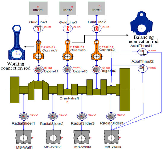 Wu et al. used multi-body dynamics to analyze the vertical loads, oil film pressure, and journal orbit trajectories of big-end and small-end bearings of connecting rods in a two stroke marine diesel engine [9].