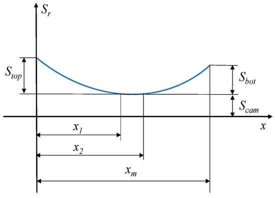 where Scam is the radial offset of the nominal diameter of the journal, Stop and Sbot are the radial variations at the left and right ends of the bearing profile, respectively, x is the bearing axial direction, Sr is the sum of Scam and the radial variation, x1 and x2 are the axial coordinates of the two ends of the bearing profile’s middle segment, and xm is the bearing width. T1 and T2 are the power exponents of the left and right segments of the bearing profile—each with a value of three—a and b are the lengths of the half major axis and half minor axis of the hyperelliptic profile, respectively, n is the power exponent of the hyperelliptic profile representing ovality, and n is six in this paper.