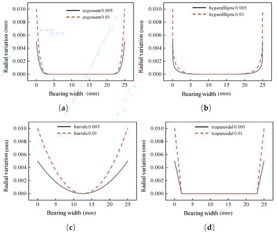 Comparison between different bearing profiles with different maximum radial variations. (a) Exponential profiles; (b) hyperelliptic profiles; (c) barrel profiles; (d) trapezoidal profiles.