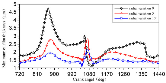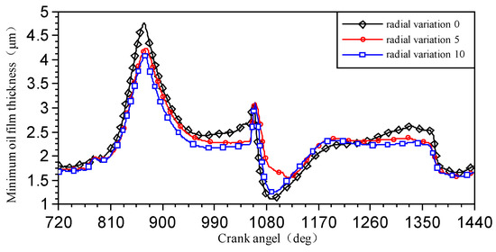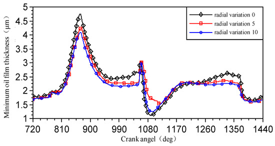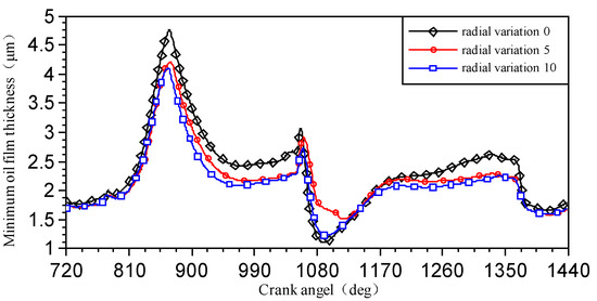 Figure 7 shows that the MOFT given by the hyperelliptic profiles also had minimum values at approximately 1090° crank angle. As the maximum radial variation increased from zero to 0.005 mm and then 0.01 mm, the MOFT first increased from 1.11 μm to 1.56 μm and then decreased to 1.26 μm. The 0.005 mm profile provided an increase of 0.45 μm in the MOFT relative to the baseline, and the 0.01 mm profile provided an increase of 0.15 μm.