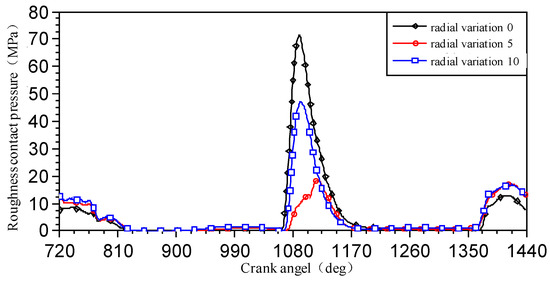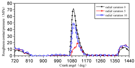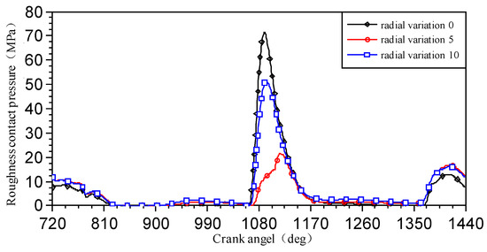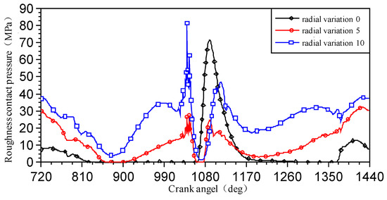 Figure 12 shows that when the maximum radial variation of the trapezoidal profile was 5 μm, the maximum roughness contact pressure occurred at a later timing of approximately 1115° crank angle. When the maximum radial variation increased from the baseline to 0.005 mm and then 0.01 mm, the roughness contact pressure first decreased from 71.57 MPa to 21.49 MPa and then increased to 51.29 MPa. Compared with the baseline profile, the contact pressure was reduced by 50.08 MPa by using the 0.005 mm profile and reduced by 20.28 MPa by using the 0.01 mm profile. The principle of reducing the contact pressure by using the trapezoidal profiles is similar to that of the exponential profiles. When the maximum radial variation is within a certain range, it can greatly reduce the contact pressure. When the maximum radial variation further increases, the probability of metal-to-metal contact becomes greater, leading to an increase in the contact pressure.