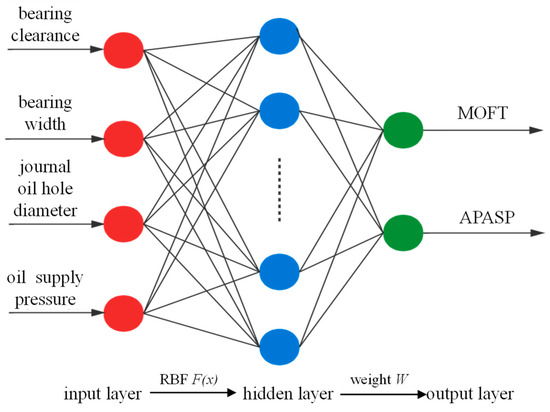 There are many artificial neural network algorithms that can be used to process DoE data. The radial basis function (RBF) neural network was selected as the fitting method to build an emulator model. The RBF neural network has a three-layer feed-forward structure [19], which is composed of an input layer, a hidden layer, and an output layer. The input layer receives the data of the four factors. The hidden layer handles nonlinear function mapping of the input data obtained from the input layer. The Gaussian function is usually used as an excitation function [20]. The output layer receives data from the hidden layer to perform linear weighting and summation. After a linear combination is completed, the output layer exports response parameters. The RBF emulator model of bearing lubrication is shown in Figure 13.