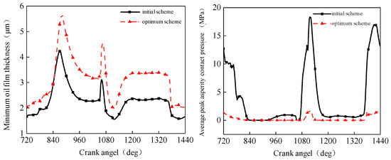 Figure 14 shows that the optimized design improved comprehensive lubrication performance by raising the MOFT from 1.56 μm to 1.97 μm, with an increase of 0.41 μm, and reducing the APASP from 3.97 MPa to 0.25 MPa, with a decrease of 3.72 MPa.