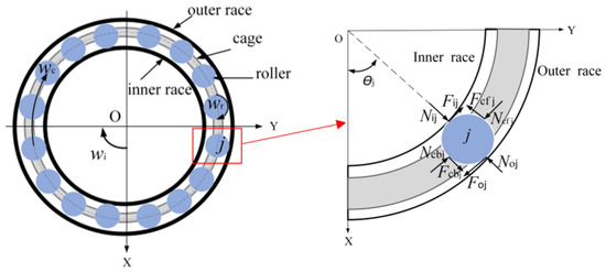 The relative motion between bearing components is mainly transmitted through contact forces, and the rigid body model [4] ignores the influence of flexible body deformation on the dynamic response of the bearing and cannot accurately simulate the motion of the rolling body. The schematic diagram of the rigid body model of the angular contact ball bearing is shown in Figure 1. In the OXY coordinate system, the inner ring rotates with the angular velocity of , and the angular velocity of the rolling body and cage are , . The jth rolling body has contact forces , , , and and friction forces , , , and with the inner and outer ring at the angular position .