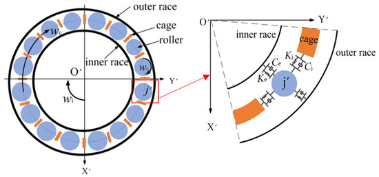In the rigid–flexible model, the contact relationship between the j′th rolling body and the inner and outer ring and cage can be defined by the following impact contact force function: