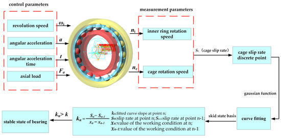 Calculating the cage slip rate determines the angular contact ball bearing slippage state [30]. The bearing slip state is analyzed by calculating and analyzing the bearing simulation speed data set, linear fitting of discrete points of the slip rate, and the determination of the critical point of the slip state. The specific method is shown in Figure 3.